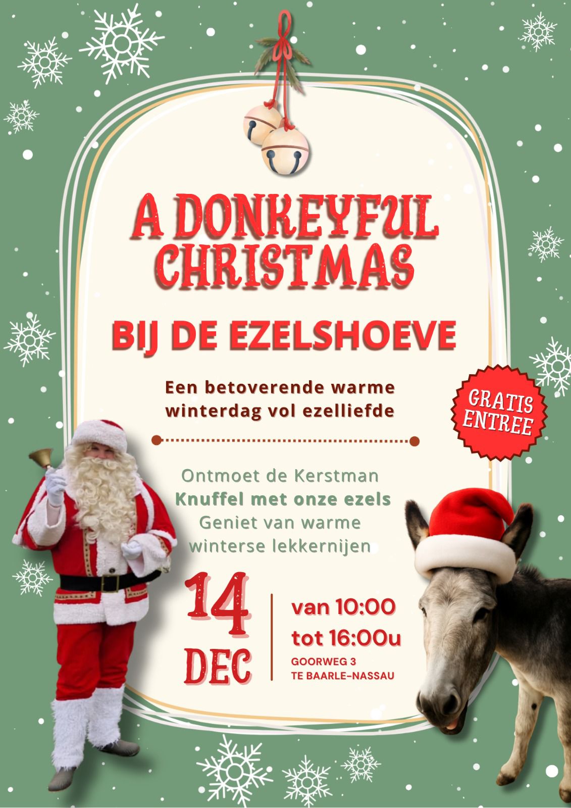 Er komt een moment dat we er zelf niet meer zijn en ook dan zullen ezeltjes op de Ezelshoeve opgevangen moeten worden. Het werk zal moeten blijven doorgaan. Juist omdat er maar zo weinig andere opties zijn moeten we die o zo belangrijke zorg waarborgen... Wees gerust.. onze opvolgers worden al opgeleid maar er is helaas ook geld nodig. Er is een mogelijkheid om nú te beslissen om later te helpen. Dit kan met jouw persoonlijke nalatenschap voor de ezels in je testament. Groot of klein, alles helpt en we zijn voor alles dankbaar. Zo draag ook jij een steen bij aan de verzorging, het voer, alle medicatie en onderhoud van de opvang. Nalaten is niet moeilijk, integendeel. Daarom ligt er iets belangrijks voor je klaar en je kunt het gratis aanvragen: een infopakket over nalaten voor de ezeltjes. Vraag ’t aan en lees hoe het werkt. Het is natuurlijk vrijblijvend en geeft je wellicht iets om over na te denken. Vraag het vrijblijvende pakket aan | | | | | A Donkeyful Christmas Kom op 14 december (van 10 tot 16u) naar Stichting de Ezelshoeve voor A Donkeyful Christmas!