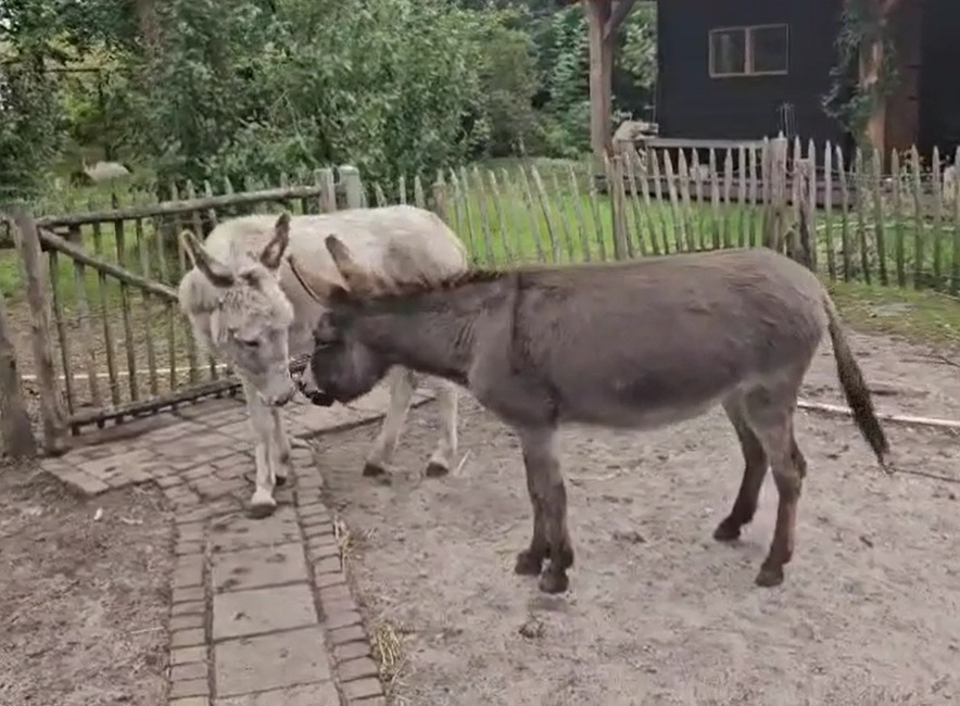 Dankzij nalatenschappen kunnen wij ervoor zorgen dat de ezels niet alleen nu, maar ook in de toekomst (dus de volgende 20 jaar) de zorg krijgen die ze verdienen. Met jouw nalatenschap maken we het mogelijk om de ezeltjes te geven wat ze nodig hebben. Omdat er zo weinig alternatieven zijn moeten wij dit doen. Het hoort bij ons, het mag niet stoppen. Wil je meer weten over hoe dit in z’n werk gaat en welk groot verschil jouw nalatenschap kan maken? Vraag ons gratis informatiepakket aan. Het is vrijblijvend en je zit nergens aan vast. Lees verder | | | | | | Welkom Joep! Joep is 24 jaar oud en heeft altijd bij zijn moeder gestaan. Maar toen overleed zijn moeder en Joep treurde. Hij heeft heel veel snoepjes en eten gekregen om hem te troosten, met als gevolg dat Joep erg bourgondisch is geworden. Hij vond het erg spannend om van zijn veilige plekje weg te moeten, maar wat een heerlijk ventje is het en wat leert hij snel! Bij aankomst op de Ezelshoeve gaan nieuwe ezels altijd even een nachtje in de quarantainestal om de stress van het transport kwijt te raken. Maar in dat stalletje kreeg hij al snel gezelschap ... | | | | | Welkom Anneke! ... want diezelfde dag haalden we ook Anneke nog op. Anneke is een 12 jaar oude ezelin die ook alleen kwam te staan. Ze had altijd met een maatje in een weitje naast een kassencomplex gestaan. Ze had wel veel mensen gezien, maar ze had maar weinig echt contact met mensen gehad. | | | | | Ook Anneke vond het maar spannend en nadat we haar gewogen hadden, zetten we haar bij Joep in de Q-stal. Alle twee waren erg rustig en beleefd naar elkaar en ik denk dat ze beide blij waren dat ze niet alleen waren. | | | | | De volgende dag zijn ze samen voor een dagje naar wei 3 gegaan. We wilden ze even de tijd geven om aan elkaar te wennen, voor we ze de kudde in zouden doen. En hoewel dat ze nogal verschillen in leeftijd kleefden ze aan elkaar en vonden het helemaal prima. Alleen toen kwam het nieuws dat Anneke waarschijnlijk 'to the rescue' zou gaan. We besloten Gorki bij Joep en Anneke te zetten. | | | | | Anneke to the rescue Pien was op heel jonge leeftijd haar moeder verloren en is door haar vader opgevoed. Haar hele leven stond haar vader naast haar en toen die overleed, treurde Pien enorm en wilde niets meer. Anneke is een rustige madam die gewend was om met één andere ezel te staan. Dus brachten we Anneke naar Pien en hoewel Pien in de eerste seconde 'als een hengst' reageerde, was het daarna eigenlijk meteen goed. Anneke was niet onder de indruk en Pien volgde haar op de voet. Pien moet nog een beetje leren dat je voer moet delen, maar ook dat komt wel goed. Een prachtige match! | | | | | Joep de kudde in Toen we Anneke weggebracht hadden, hebben we Gorki en Joep nog een dagje samen gelaten. Maar toen kwam toch het moment dat Joep geïntroduceerd zou worden in de kudde ... En wat deed Joep dat prachtig. Totaal rustig en totaal niet onder de indruk liep hij de kudde in en begon echt met iedereen kennis te maken door te neuzelen. Ook de kudde reageerde (weer) totaal rustig en ik geloof niet dat Joep ook maar één keer heeft moeten rennen op zijn eerste dag. | | | | | Mooi hoe met name de oud-gedienden gewoon even kwamen kennismaken. Alsof hij zijn leeftijd met verve draagt. | | | | | De Open Dag Ondanks dat het weer erg grauw was met af en toe een buitje, waren er ruim 300 mensen gekomen. Maar nu het terrein drie keer zo groot is geworden verdwijnen die mensen in het totale beeld. Het was gezellig druk en we hebben mooie gesprekken gehad, Ezel-bier gedronken en Currywurst gegeten. En de warme, homemade VEGAN pasta was ook errug lekker! Met grote dank aan Jennifer, die alles klaargemaakt had. | | | | | De digitale collecte is gestart Elk jaar rond Wereld Dierendag is er de digitale collecte voor dierenwelzijns-organisaties. Dit wordt georganiseerd door DierenLot en zij verdubbelen elke donatie (tot maximaal 100€ per rekeningnummer). De collecte loopt tot en met 6 oktober. Hoewel op de site van DierenLot staat dat ze tot een maximum van 2.500€ per organisatie verdubbelen, hebben ze de laatste jaren toch het totaal bedrag verdubbeld. Hoop doet leven en elke Euro in één van onze bussen is sowieso voor ons! Doneer in onze digitale bus | | | | | Hele grote wortelen Soms hebben we enorme peeën, heeeele grote wortelen. Die zijn met een mes al bijna niet door te snijden en de ezeltjes krijgen die niet doorgebeten. De enige manier is telkens kleine stukjes van de zijkant bijten. Tsja, maar we hebben natuurlijk ook de Poitou's. En de Andalusiërs. De allergrootsten zijn voor Quincet, die ze als enige doorgebeten krijgt. De iets kleinere zijn dan weer voor Dahlia. #LaVieEstBelle met peeën op maat van onze giganten. | | | | | 't is een bijzonder kind en dat is-ie Mooie, lieve Copain blijft een uniek ezeltje. Met zijn pootjes te kort en zijn knietjes te dik staat hij 'vierkant', een beetje als een Franse Bulldog. Zijn ondertandjes staan recht naar voren waardoor het letterlijk een centenbakje is, maar wat een lieverd is het. Zoals René zegt: "Alle ezels zijn speciaal, maar jij bent specialer," en dat is-ie. Als er al een ezel is die geen vlieg kwaad doet is het dit kleine mannetje wel. Ondanks dat, is Copain geen hardloper in de adopties, wat je enigszins wel zou verwachten. Maar hij komt zeker geen liefde te kort. | | | | | Welkom Bam Bam En toen stonden we oog in oog met een dubbelganger van Onyx ... Guusje had 17 jaar op één adres gestaan, samen met een paardje en de laatste 2 jaar alleen. Het was tijd voor een nieuw hoofdstuk voor Guusje en hij was er helemaal klaar voor. Normaal gaat P-P kennismaken, waarna de mensen eerst binnen de administratie afhandelen. Niet bij Guusje. Hij liet P-P niet meer los tot hij in de trailer stond en wachtte nauwelijks tot de hekjes van de trailer open waren. Dat was duidelijk. Omdat we nogal wat Guusjes en varianten van die naam gehad hebben, besloten we hem Bam Bam te noemen. | | | | | In de spiegel Na een nacht in de quar